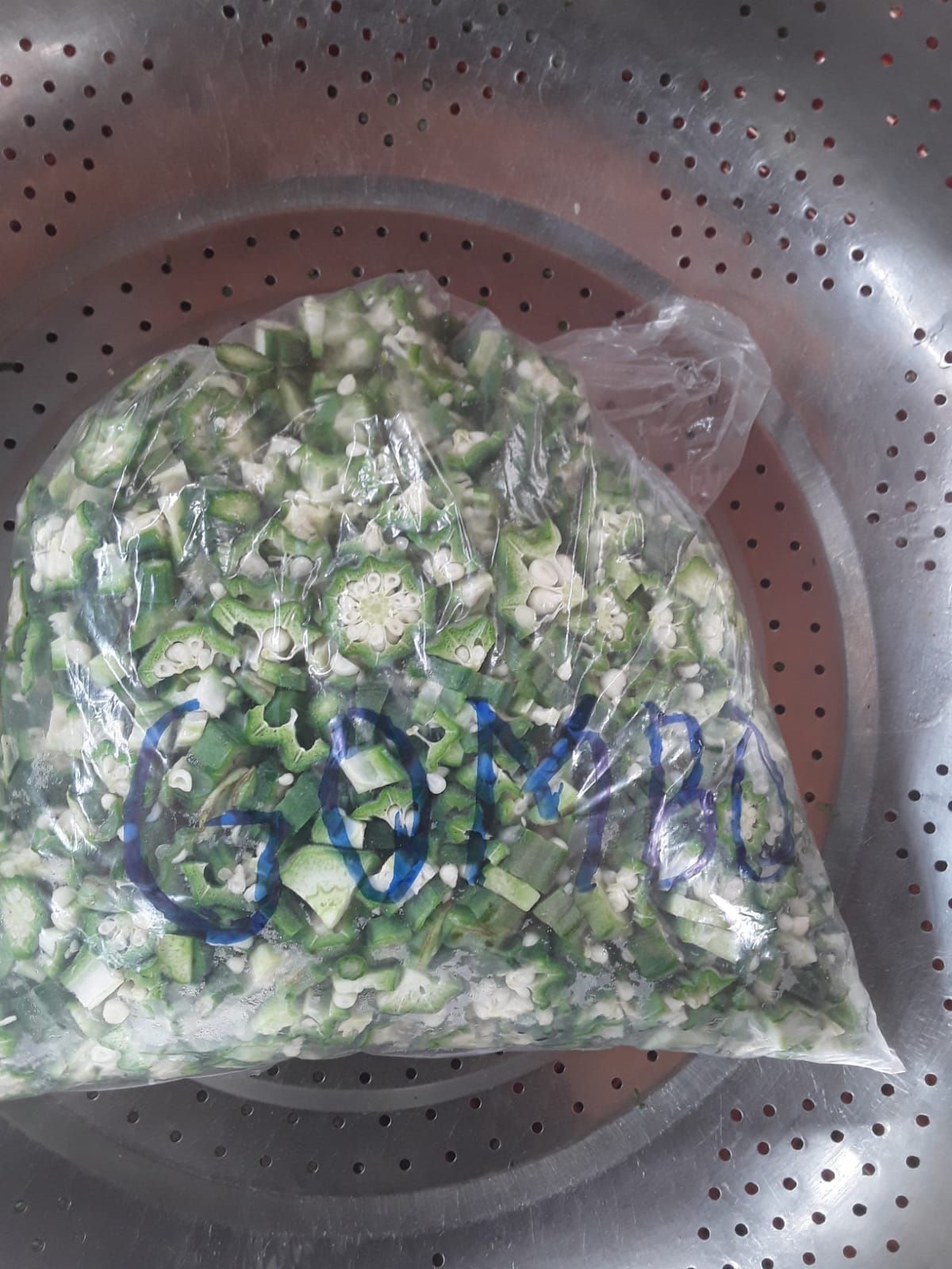 Gombo frais découpé, prêt à cuisiner pour un repas de 10 à 12 personnes.
